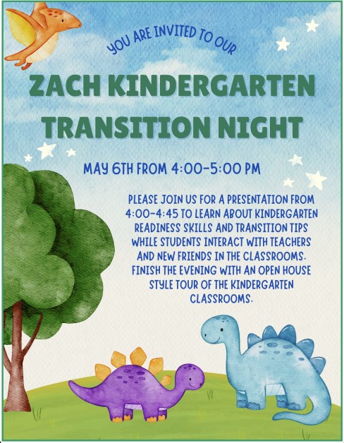 Parents and Guardians please join us on Tuesday, December 3rd from 5:30pm - 6:30pm at Zach Elementary to learn about all things kindergarten! This night will be an adult presentation of our kindergarten program. Our 5th grade students will host tours of the school during our Kindergarten Information Night too, however; if you cannot attend Kindergarten Information Night or need additional information, join us for a Friday morning tour. Sign up for tours HERE.